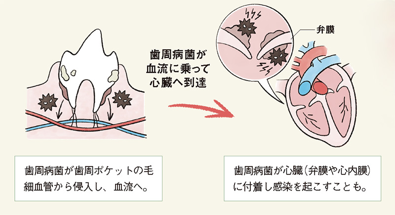 その行き着く先のひとつが心臓。歯周病菌は心臓の弁膜に付着して、炎症を引き起こし、弁膜症に発展することもある。