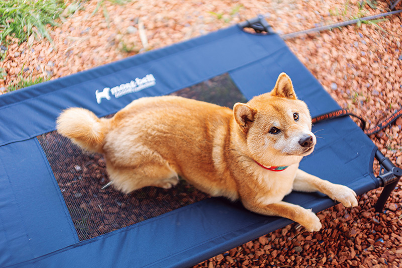 サイトに愛犬の居場所をつくるならドッグコットがおすすめ。メッシュ素材なら風通しがいいので、夏も快適に過ごせる。ただし犬によっては、乗った時の沈み込む感じを嫌がるので、あらかじめ家で慣らしておくようにしたい。