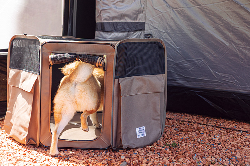 コットを嫌がる犬には、ドッグサークルを使ってみよう。天板があり出入り口を閉めることができれば、クレートのように利用できる。アウトドア用ならコンパクトに畳めるし、ペグで地面に固定もできるので安心だ。ただしドッグコットと同様、キャンプ場で初めて使うと入るのを嫌がる可能性もある。事前に家で慣らしておこう。