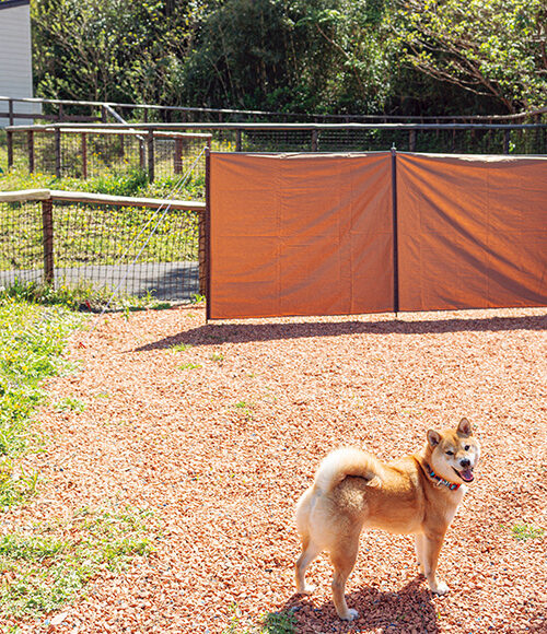 ドッグフリーサイトでも素通しのフェンスだった場合、サイドウォールがあると便利。他の犬が視界に入ると気になる犬の緊張緩和に役立つ。ただし音に反応する犬は、視界を遮るとかえって強く反応することがあるので注意。