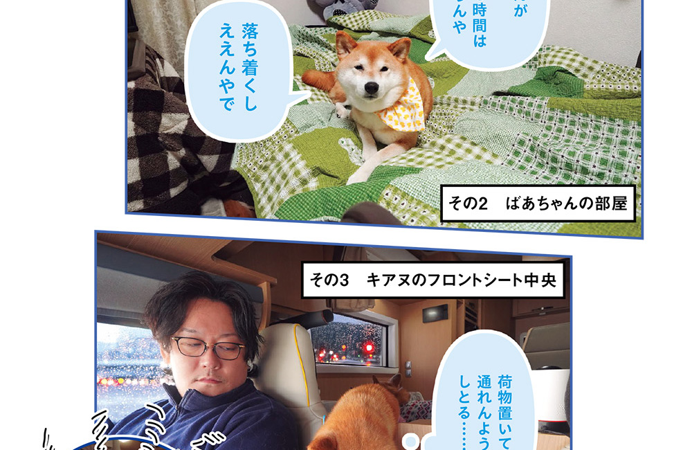 さてこの3箇所でランキングを決めていただきます! スティーブさん、一番好きなのはどこ?「ほんまに甲乙つけがたいんよなぁ……全部1位でええと思う」たぶんこんな感じ。こたつでは「全身入る。のぼせたら半身出す」を永遠に繰り返してサウナのように整っている気さえします。ばあちゃんの部屋では、時々ばあちゃんにいるのを忘れられるくらい静かに過ごしています。唯一、道路に面している部屋なので外の様子も伺ったりしています。キアヌ(キャンピングカー)のフロントシート中央。こちらはコーギーのハルも狙っているのですが譲りません。もう専用のクッションを買いました。