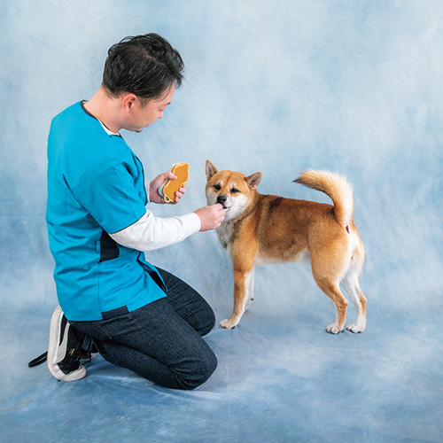 犬の体にブラシを軽く当て、すぐにオヤツを与える。ブラシの感触をごほうびと関連づけることで警戒心を和らげ、ブラシがオモチャではないことも理解させる。