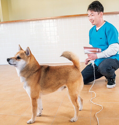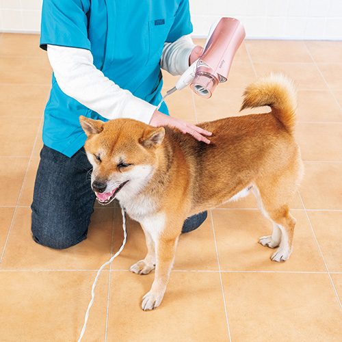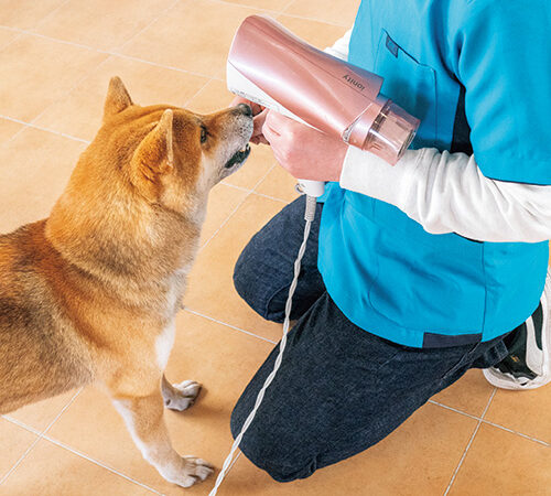 ドライヤーの音→風の順に慣らしていく。温度や風量調節ができるドライヤーを選び、弱風から当てていく。実際に自宅でシャンプーするのは、犬がドライヤーに完全に慣れてからにする。