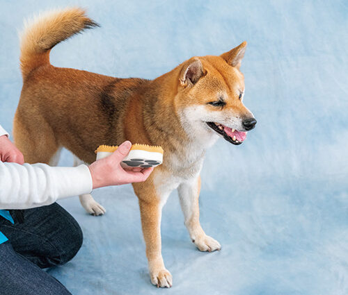 犬の体にブラシを軽く当て、すぐにオヤツを与える。ブラシの感触をごほうびと関連づけることで警戒心を和らげ、ブラシがオモチャではないことも理解させる。
