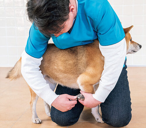 犬が落ち着いていられる体勢で、爪切りを当ててオヤツを与える。嫌がらなければ少しずつ爪を切っていく。