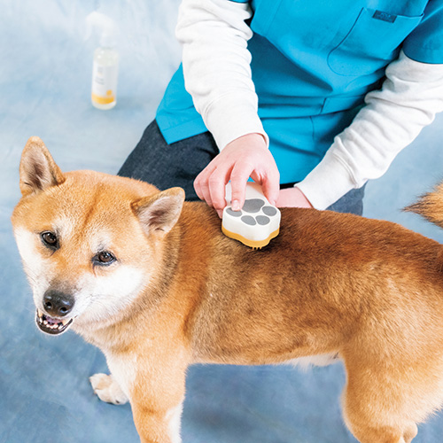 犬の横に座るなどして、背中からブラッシングを開始。力を入れず、毛の流れに沿ってとかしていく。痛みを与えないため、肌への刺激が少ないラバー製のブラシがおすすめ。